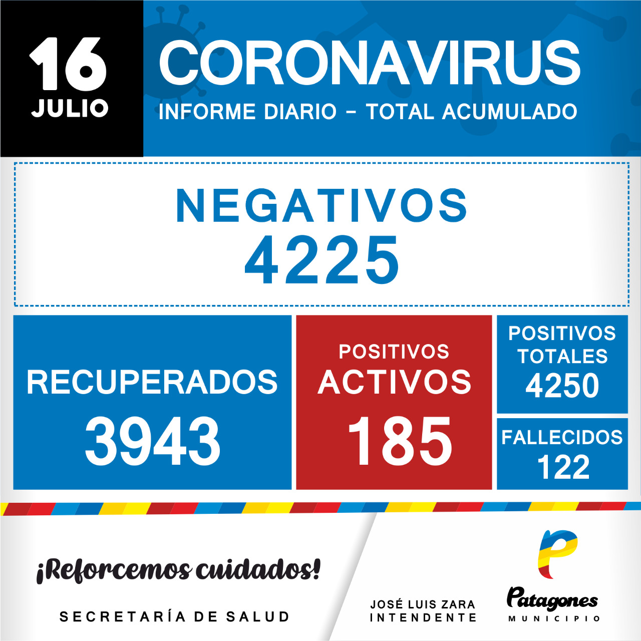 A la fecha, son 185 los positivos activos, 4225 los estudios con resultado negativo y 3943 los pacientes recuperados.