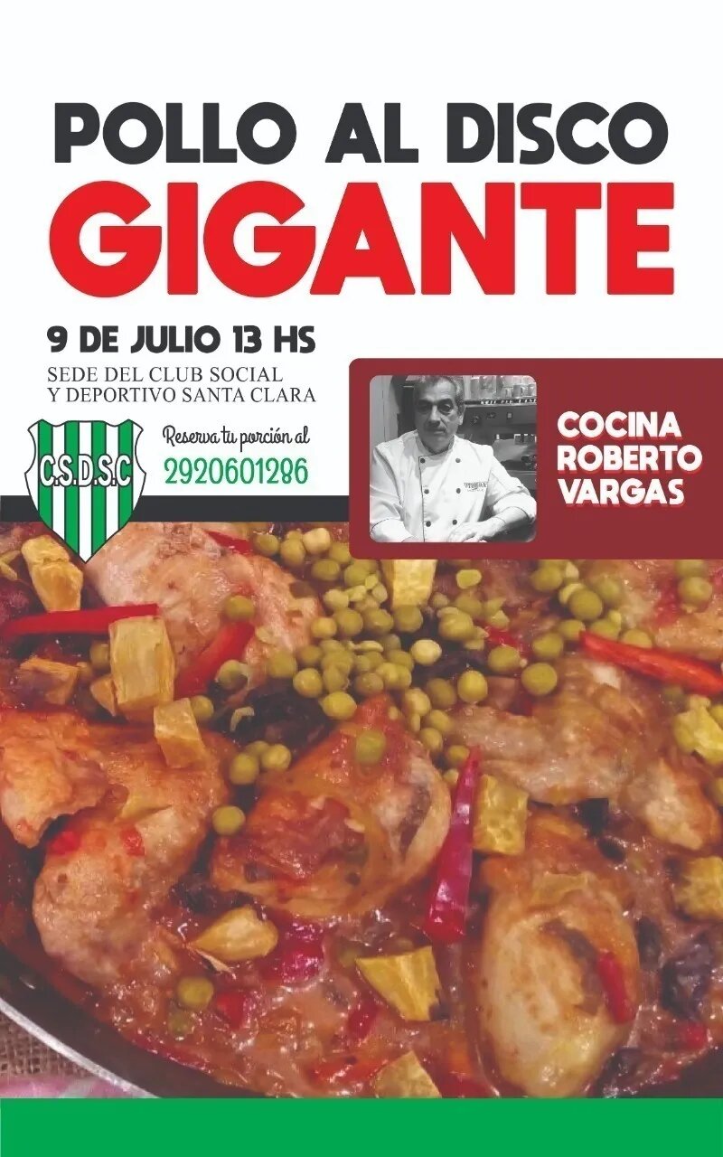 En primer lugar, se llevará adelante a partir de las 13 horas -con la presencia del reconocido chef Roberto Vargas-, el «Pollo al Disco Gigante Solidario» que tiene como finalidad, con lo recaudado por la venta de cada porción (a solo $700) ayudar a las divisiones infantiles del Club Santa Clara.