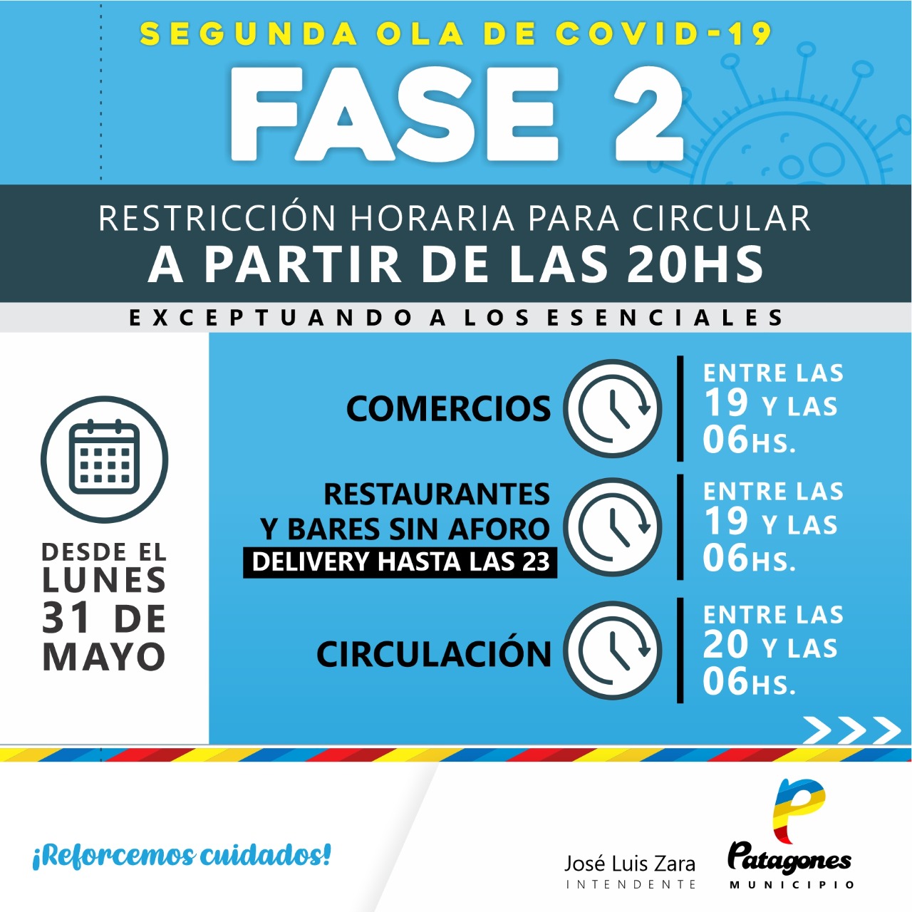 La Municipalidad de Patagones informa a la comunidad que, de acuerdo a las disposiciones del Gobierno Provincial, a partir de mañana, lunes 31 de mayo, y en base a la situación sanitaria actual, el Distrito ingresará a la Fase 2.
