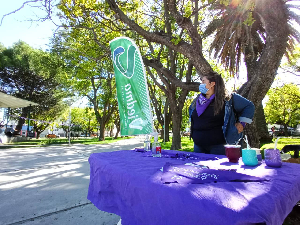 Las actividades se desarrollaron durante la mañana de hoy, en la plaza San Martín de la capital provincial, e incluyeron muestras artísticas, instalaciones, el repintado del Banco Rojo y la entrega de folletería y pañuelos violetas a las mujeres y hombres que se acercaban al lugar.