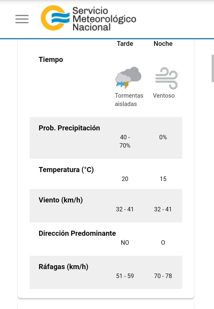 El Servicio Meteorológico Nacional establece un alerta por fuertes vientos con ráfagas de hasta 80km/h para la tarde-noche del día de hoy jueves.