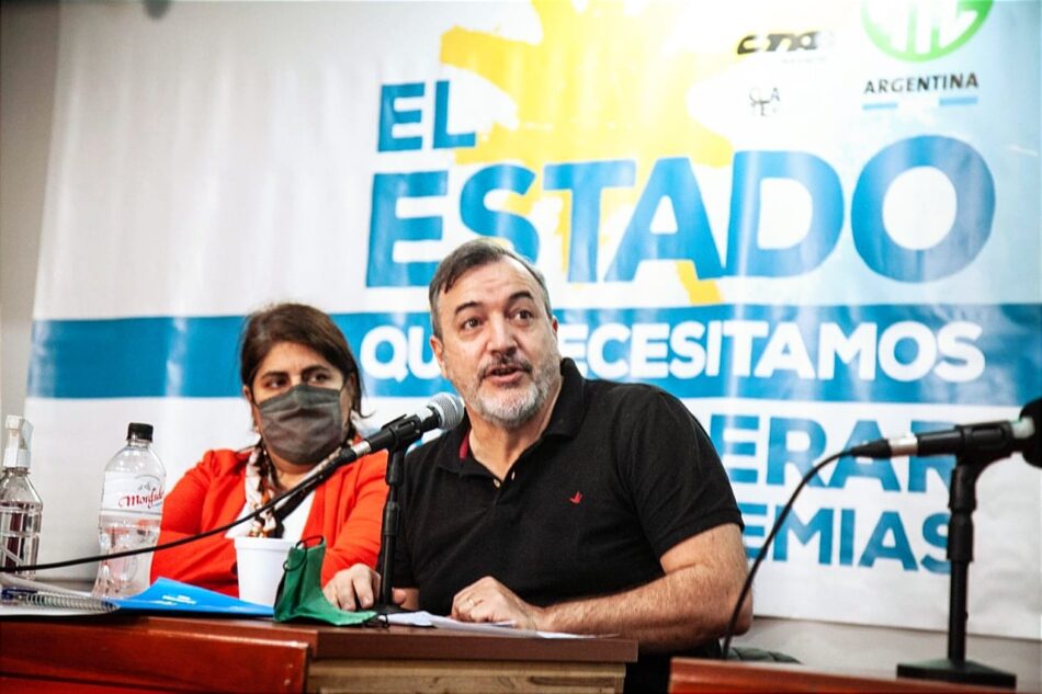 En el marco de la jornada de debate sobre “El Estado y la Democratización de las Relaciones Laborales” que se realizaron en la sede nacional de la Asociación Trabajadores del Estado (ATE), el Secretario Adjunto del sindicato, Rodolfo Aguiar, propuso la creación de un “Fondo Federal Salarial Estatal destinado a la recuperación de los ingresos de los trabajadores de la administración pública nacional, las provincias y los 2.300 municipios de la Argentina” y para financiarlo exigió la restitución de los impuestos al champagne a las herencias, derogados durante el gobierno de Macri y la dictadura, respectivamente.