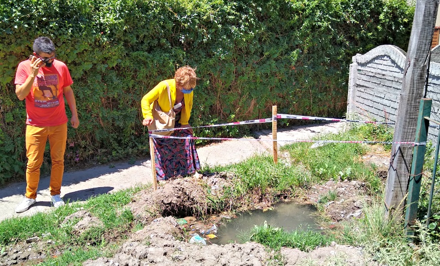 La Defensora junto al presidente de la Junta Vecinal del Guido, Sergio Testore, recorrieron diferentes sectores del barrio donde ya forman un paisaje habitual las lagunas que se forman por los desbordes de líquidos cloacales e importantes pérdidas de agua potable.