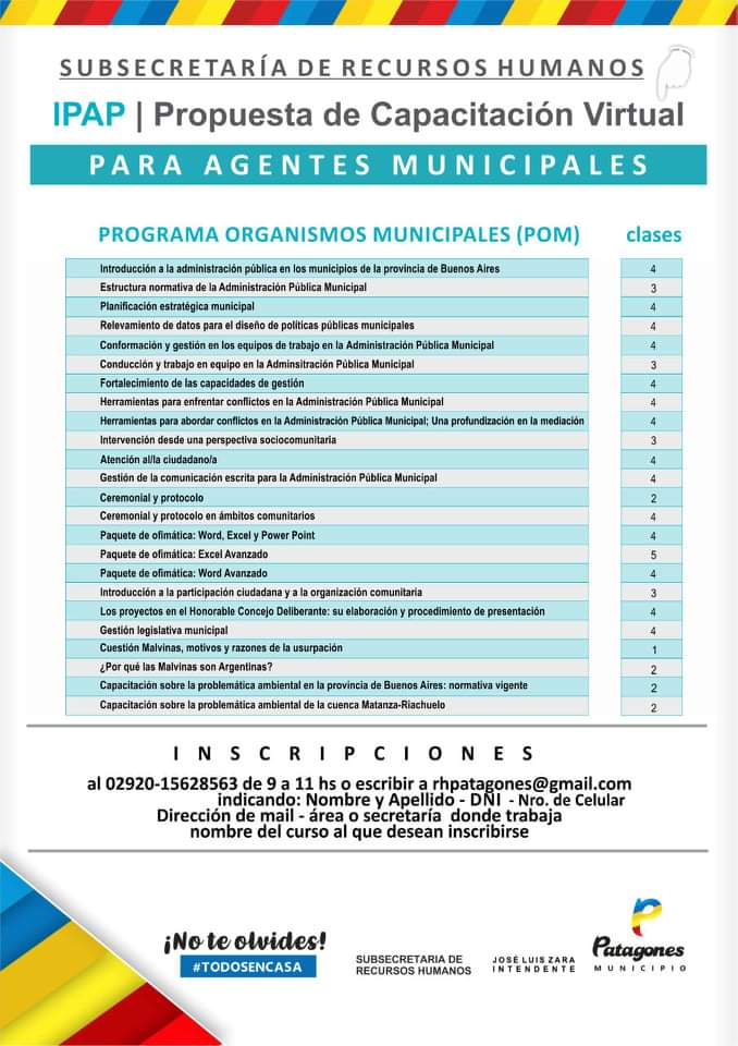 Los interesados pueden comunicarse con la Subsecretaría de Recursos Humanos, al 02920-15628563, de 9 a 11 horas, o escribir rhpatagones@gmail.com, indicando: