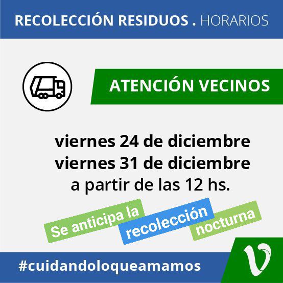 En relación a los barrios que disponen de servicio de recolección nocturna, se resolvió adelantar la recorrida para las 12 horas, desde el mediodía de los días 24 y 31 de diciembre. En este caso la recorrida se realizará en los barrios Belgrano, Sargento Cabral, Almirante Brown, 915 Viviendas, Zatti, Mitre, Centro, Costanera, Piedra Buena, Don Bosco, 14 de Marzo, Castello y San Roque.
