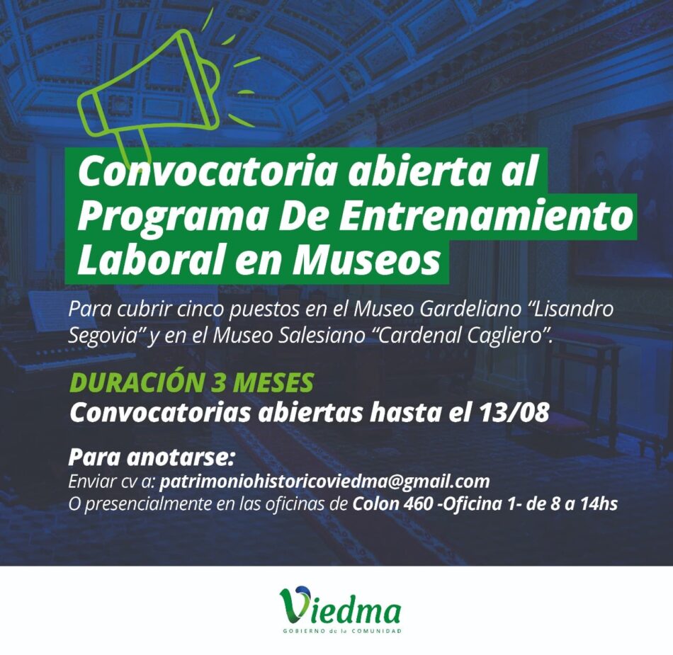El gobierno de Viedma a través de la Dirección de Identidad Comunitaria, abre la convocatoria para cubrir cinco puestos en el Programa de Entrenamiento Laboral rentados en el Museo Salesiano “Cardenal Cagliero” y en el Museo Gardeliano “Lisandro Segovia”.