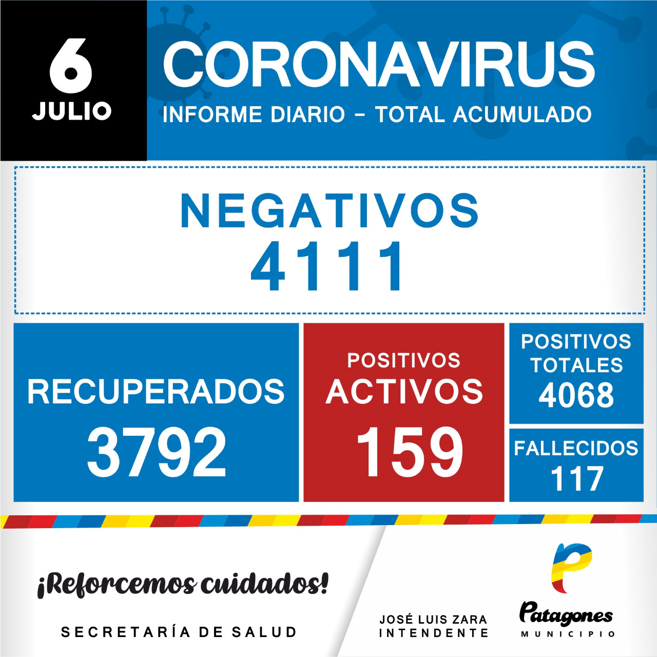 A la fecha, son 159 los positivos activos, 4111 los estudios con resultado negativo y 3792 los pacientes recuperados.