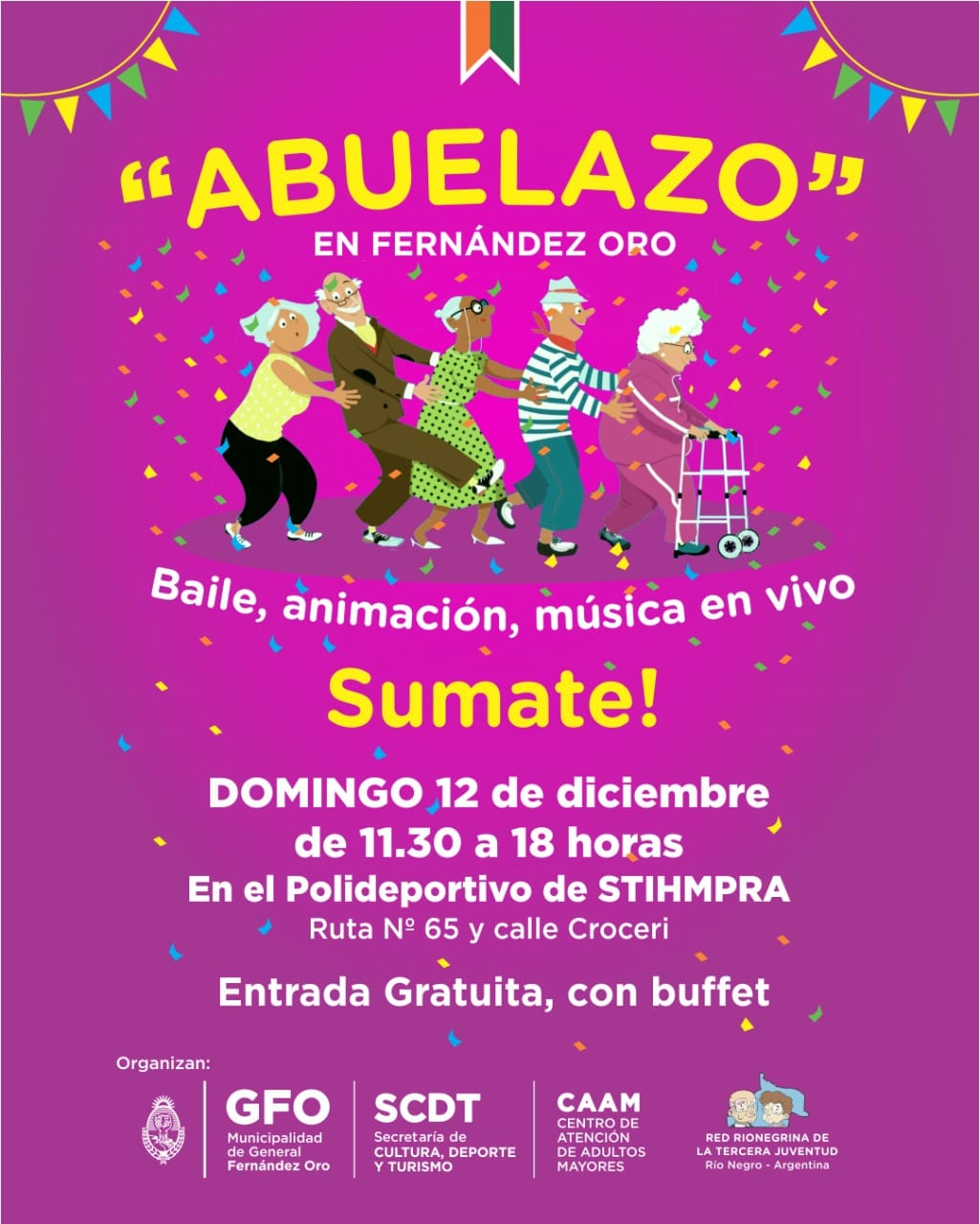 El evento contará con baile, Show y habrá buffet disponible. El Abuelazo es posible gracias al trabajo articulado de la RED Rionegrina de la Tercera Juventud y la Municipalidad de Gral. Fernández Oro.