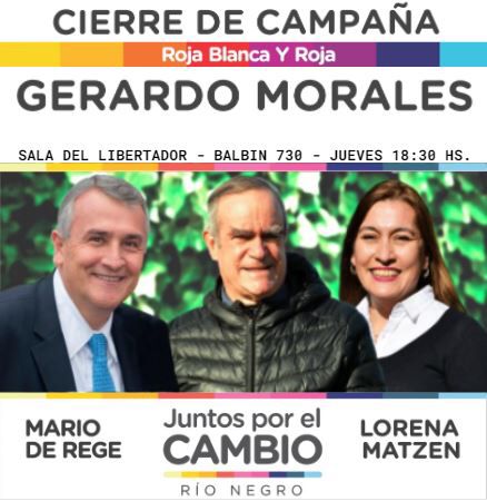 En el día de mañana, el Gobernador de la provincia de Jujuy Gerardo Morales, acompañará a Mario De Rege y su equipo en el cierre de campaña en la ciudad de Viedma.