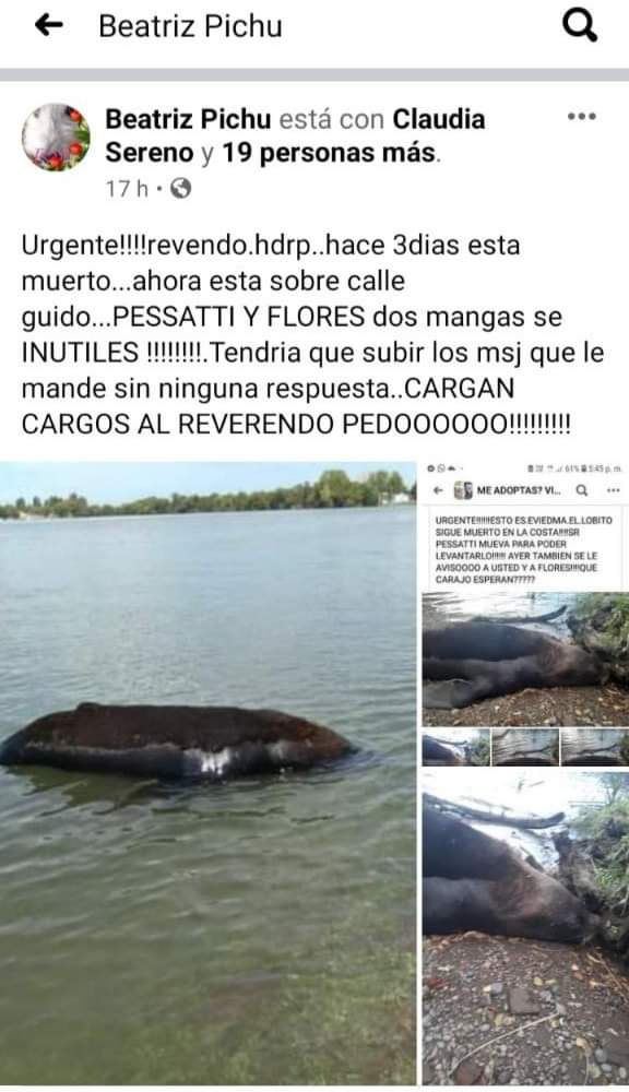 Quiero que sepan, por otra parte, que el retiro del animal del lugar donde hoy yacen sus restos es responsabilidad de la autoridad de fauna de la Provincia. El municipio no puede actuar porque los técnicos del organismo competente son los que están capacitados para intervenir, hacer los análisis del caso, establecer las causas de la muerte del animal, etc. Por eso no lo sacamos…