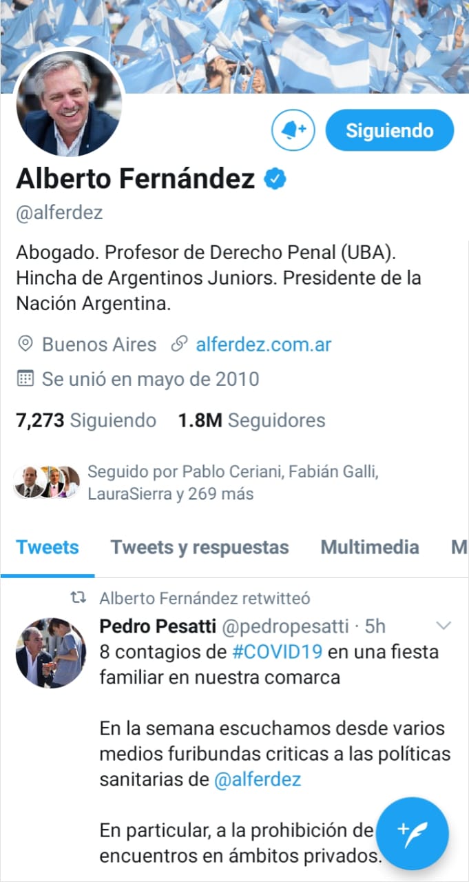 El presidente Alberto Fernández retwitteó esta noche una publicación del intendente de Viedma, en la que Pedro Pesatti manifiesta la necesidad de respetar las recomendaciones sanitarias, a la luz de los contagios producidos en una fiesta particular, en Carmen de Patagones.