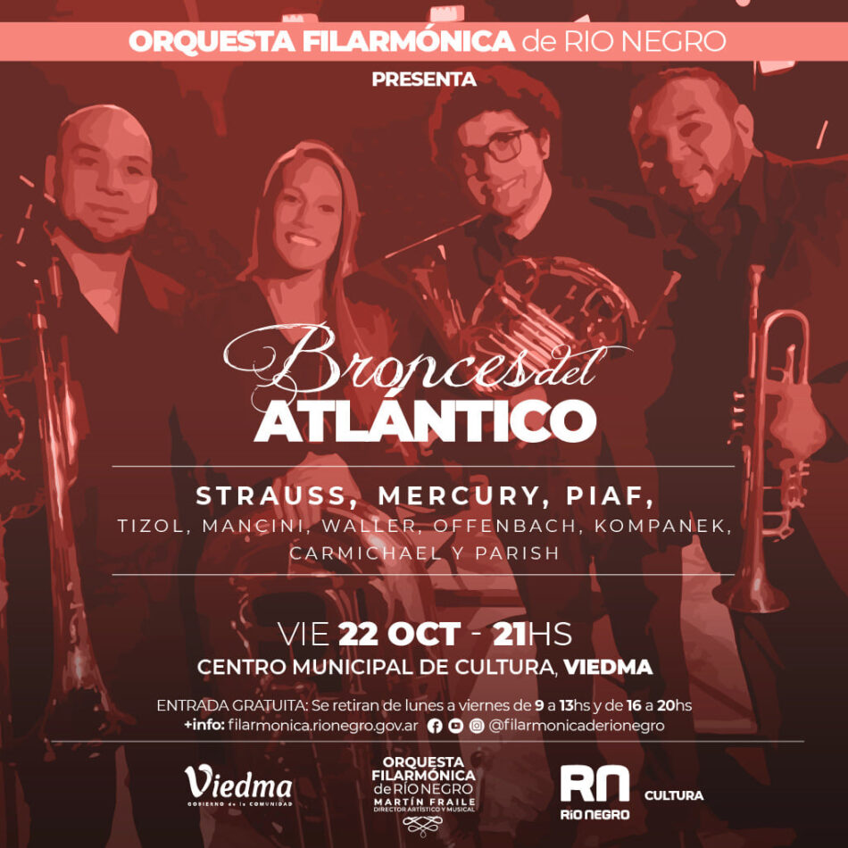 Este viernes 22 de octubre, a las 21, el ensamble de la Filarmónica de Río Negro “Bronces del Atlántico” realizará un nuevo concierto en la Sala Mayor del Centro Municipal de Cultura.