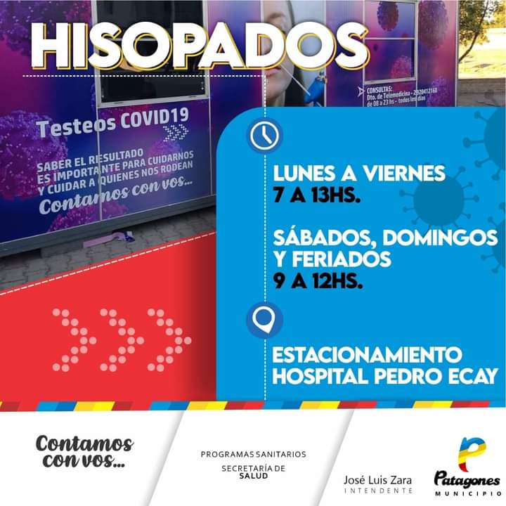 La Secretaría de Salud recuerda a la comunidad que el Centro de hisopados ubicado en el estacionamiento del hospital “Pedro Ecay” funciona de lunes a viernes de 7 a 13 horas y los sábados, domingos y feriados de 9 a 12 horas.