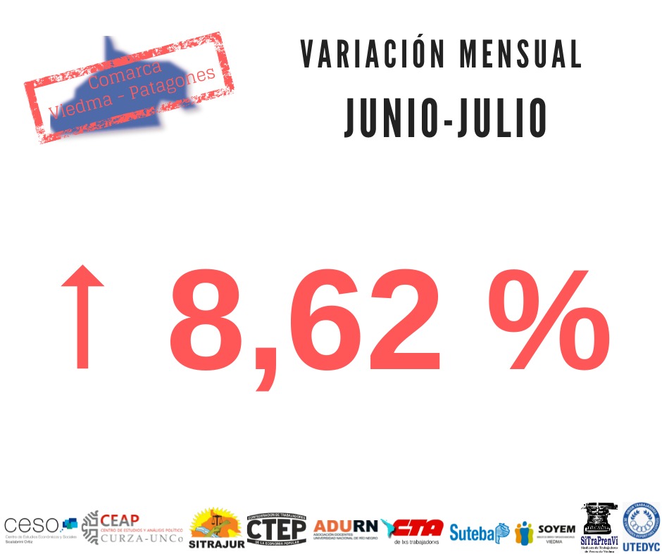 🛒 El Índice de Precios de la Canasta Alimentaria en Supermercados – Comarca Viedma-Carmen de Patagones se incrementó un 8,62% en el mes de JULIO respecto a JUNIO de 2022.