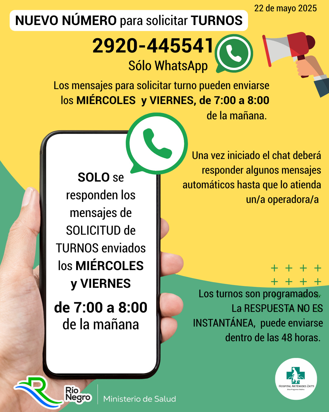 Desde el Hospital Zatti informamos a la comunidad que, a partir de este viernes, los turnos deberán solicitarse exclusivamente a través de un nuevo número de WhatsApp: 2920-445541.