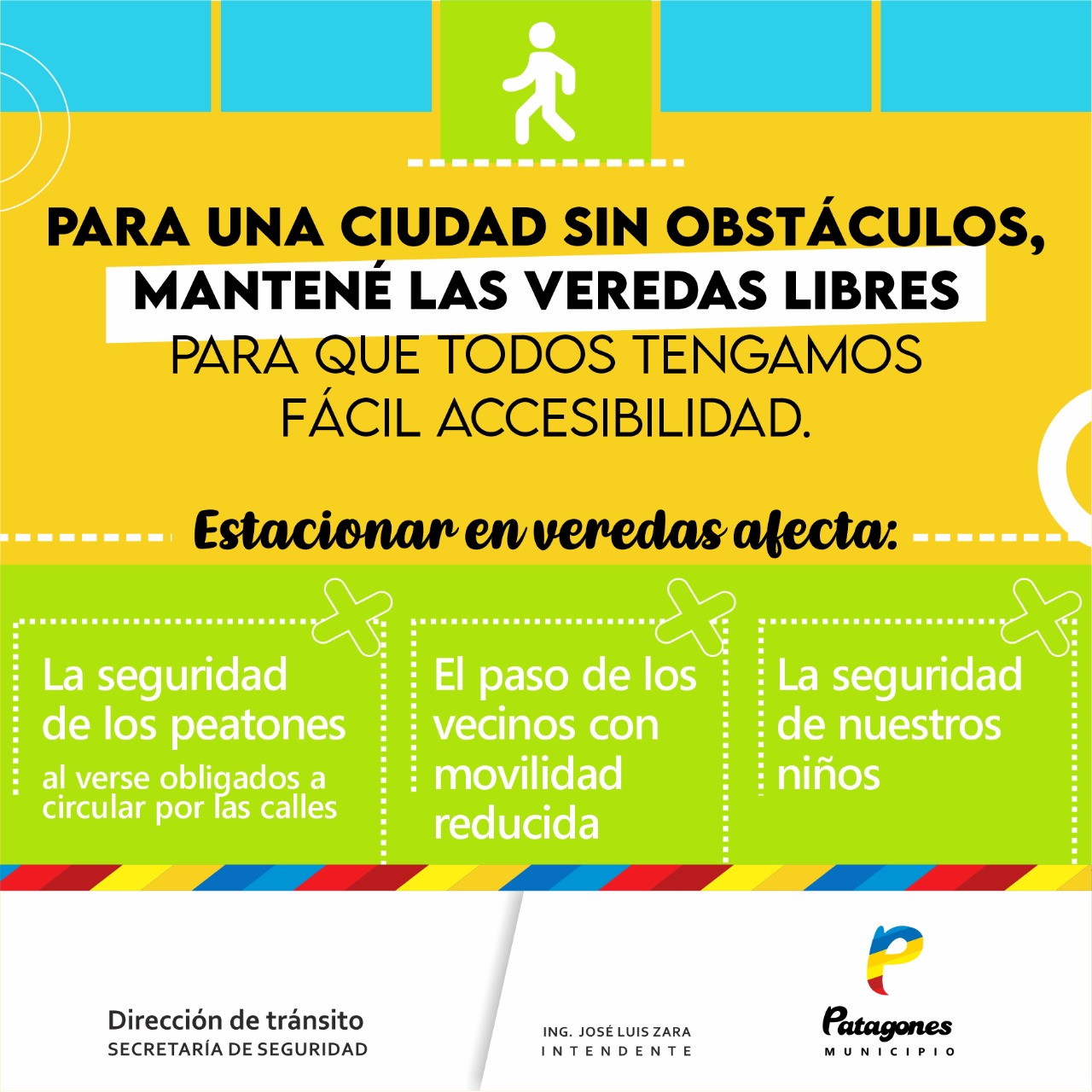 La Dirección de Tránsito, dependiente de la Secretaría de Seguridad, informa a la comunidad que, de acuerdo a la Ley de Tránsito N°24.449, se están realizando tareas de concientización en cuanto a los vehículos estacionados sobre las veredas, que interrumpen el paso de los peatones.
