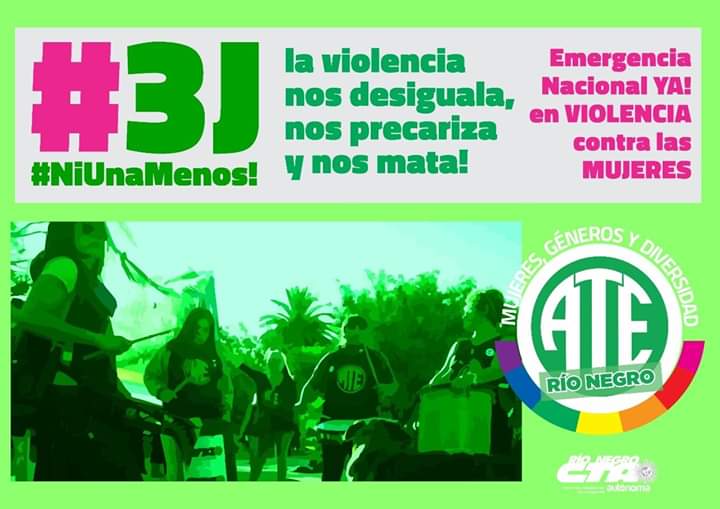 Rodrigo Vicente, Secretario General de Ate Río Negro comentó en su red social de Facebook sobre una jornada de reflexión y lucha contra la violencia hacia las mujeres (#3J) dónde dijo «Adentro y afuera, la violencia nos desiguala, nos precariza y nos mata!