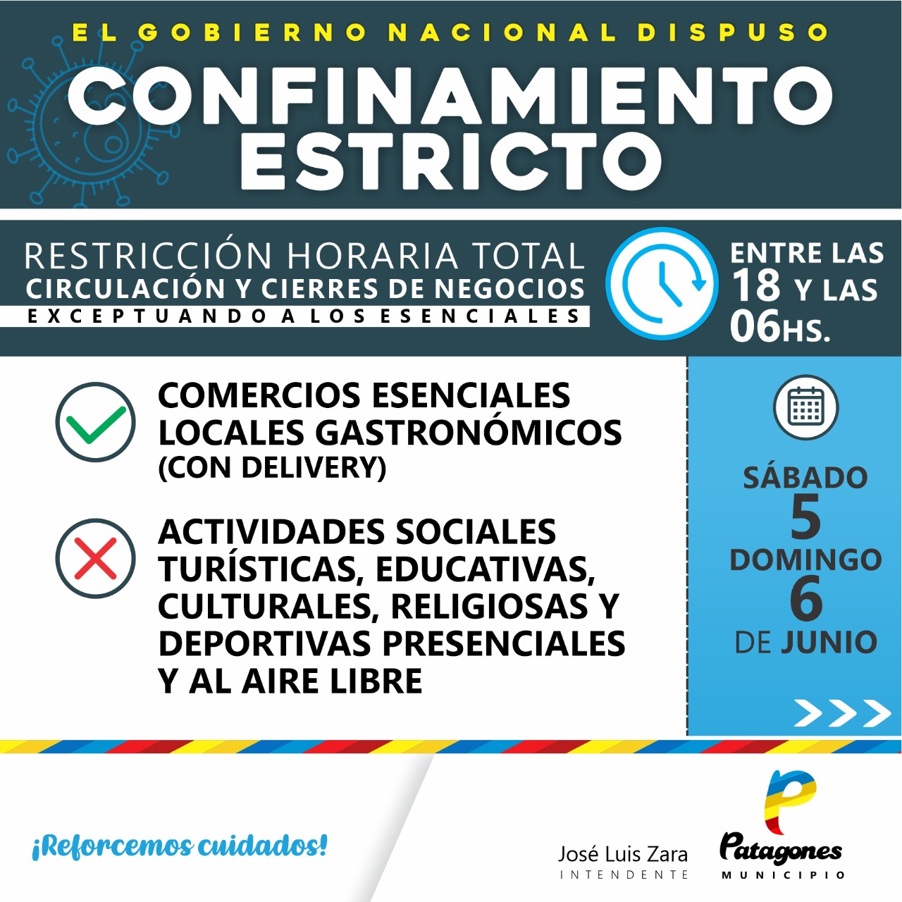 La Municipalidad de Patagones recuerda a la comunidad que, de acuerdo a lo dispuesto por el Gobierno Nacional, el Distrito de Patagones vuelve a confinamiento estricto desde las 00 horas de este sábado, 5 de junio, hasta el domingo 6, inclusive.