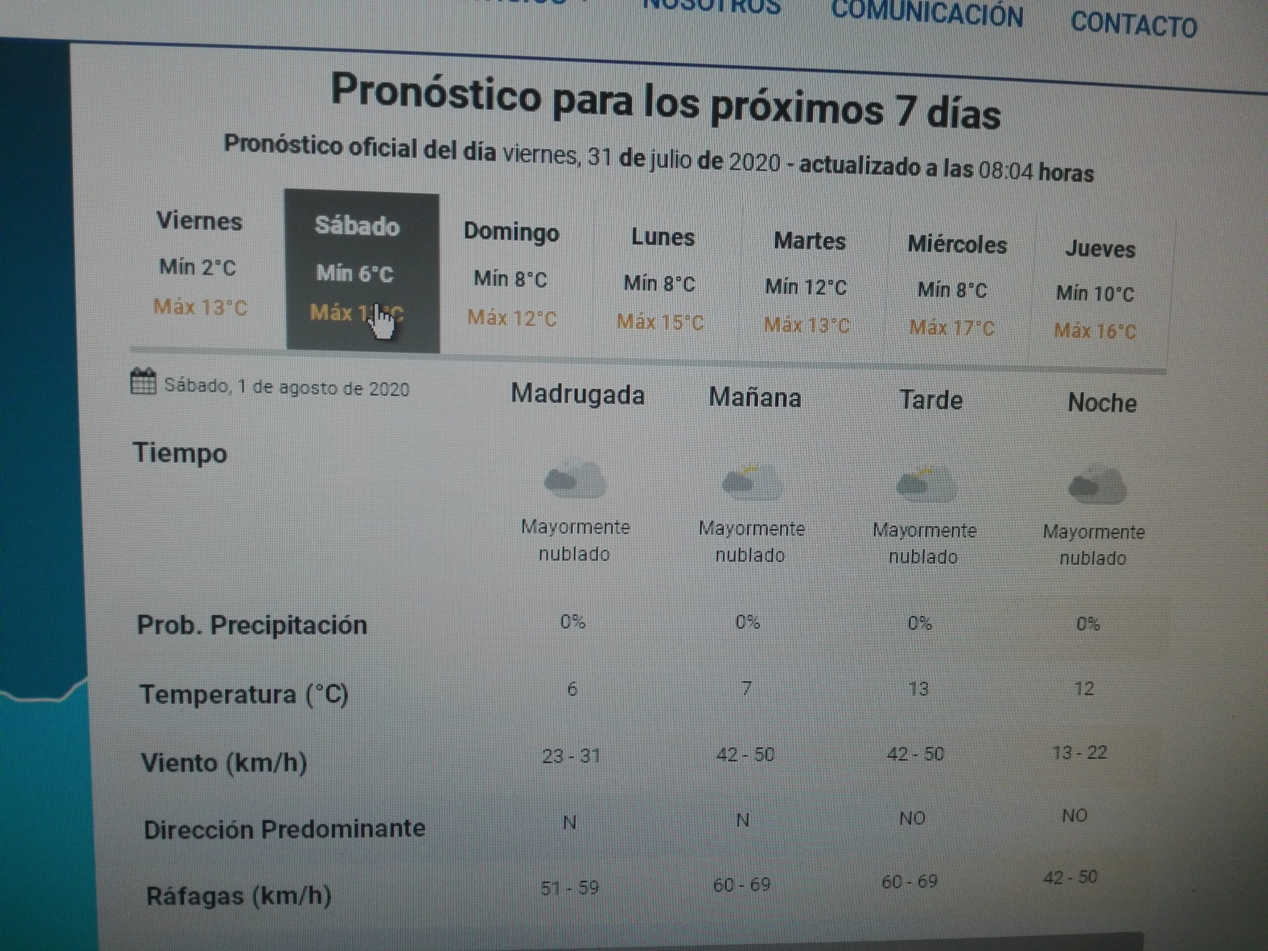Según el Servicio Meteorológico Nacional, en la jornada de mañana sábado 01 de agosto anticipa fuertes vientos con ráfagas de entre 60-69 km/h.