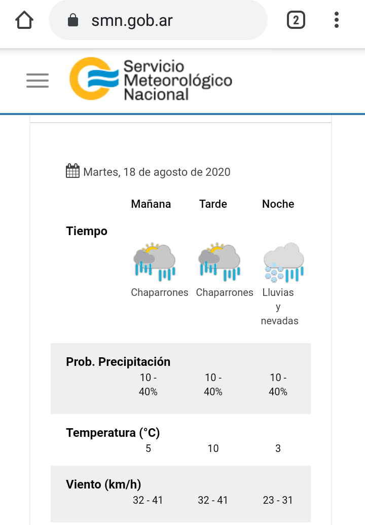 El pronóstico del tiempo brindado por el Servicio Meteorológico Nacional, anticipa que tanto para esta noche de hoy martes 18 de Agosto como para el día de mañana miércoles se anticipan lluvias y nevadas para nuestra ciudad.