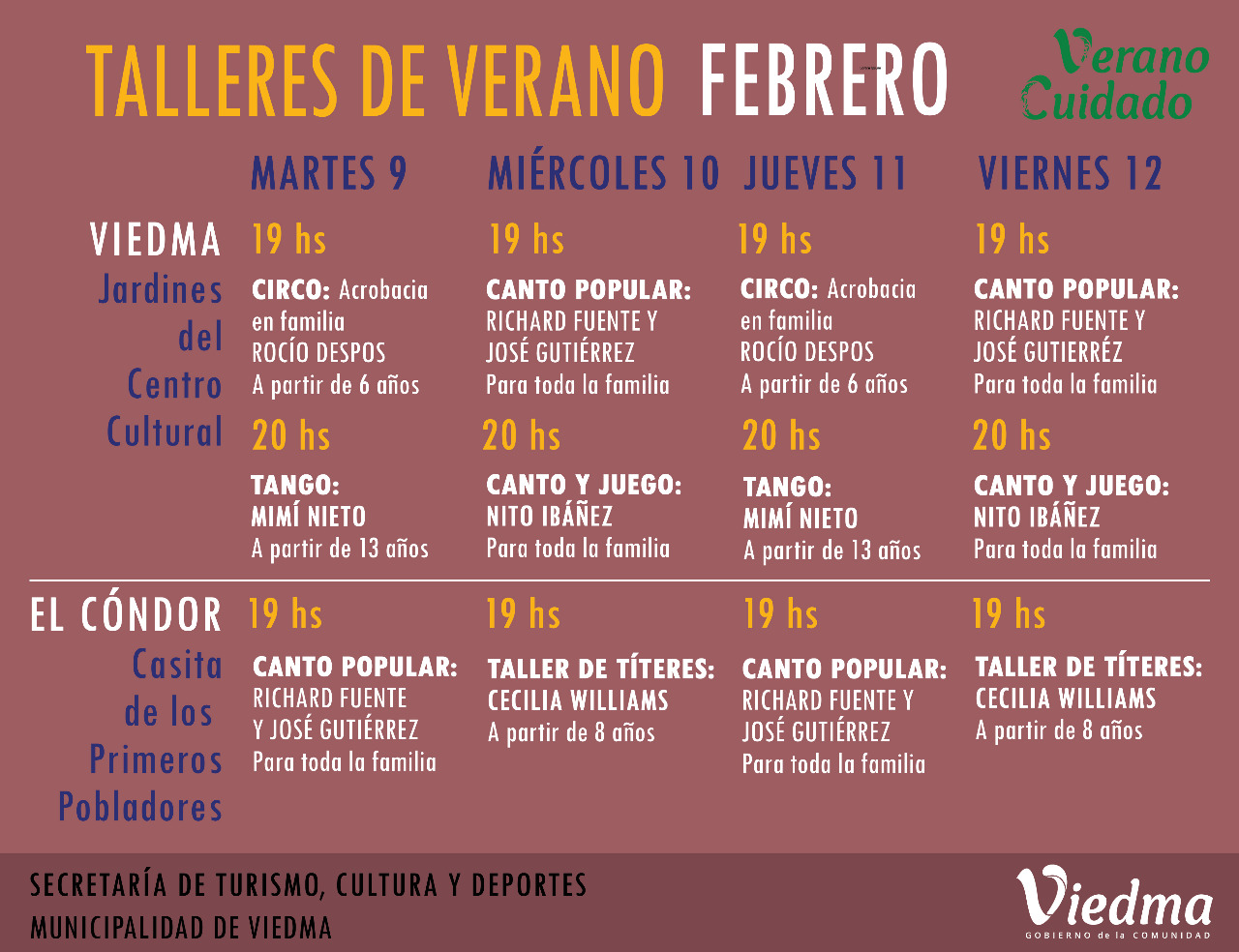 En Viedma, el martes 9 a las 19 hs se realiza el taller de Circo (Acrobacia en familia) para niños a partir de los 6 años de la profesora Rocío Despos y desde las 20 hs funciona el taller de Tango coordinado por Mimi Nieto. En tanto en el Cóndor a partir de las 19 hs el taller de Canto Popular, para toda la familia,realizado por Richard Fuente y José Gutiérrez.